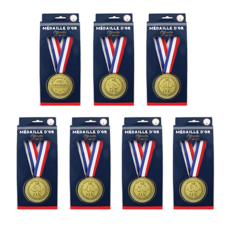 Pour un anniversaire, offrez cette médaille d’or avec large cordon tricolore spécial anniversaire. Plusieurs modèles sont proposés, au choix, pour la majorité, l'anniversaire et les dizaines : 18 ans, 20 ans, 30 ans, 40 ans, 50 ans et 60 ans.