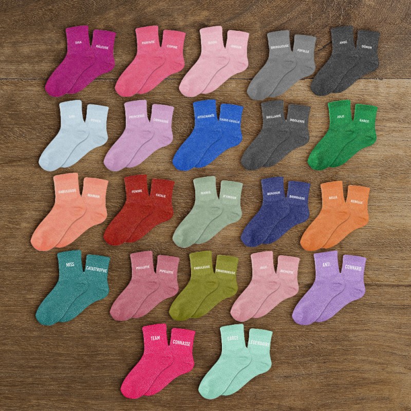 Ces chaussettes pailletées hautes en couleur mettent en avant une combinaison de deux mots, disponibles en différents modèles.