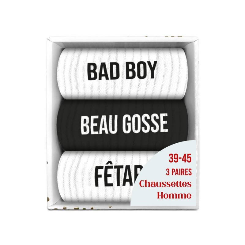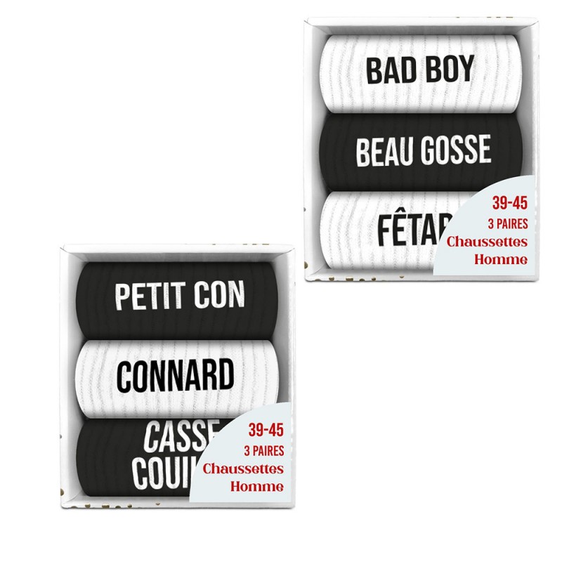 Coffret trio de chaussettes homme noires et blanches fantaisie.