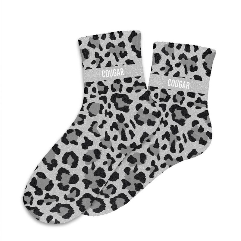 Ces chaussettes pailletées hautes en couleur et à l'imprimé félin mettent en avant un mot rigolo ou emblématique sur chaque chaussette.