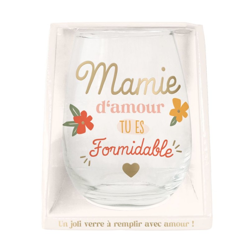 Ce joli verre coloré spécial mamie affiche le message « Mamie d'amour tu es formidable ».
