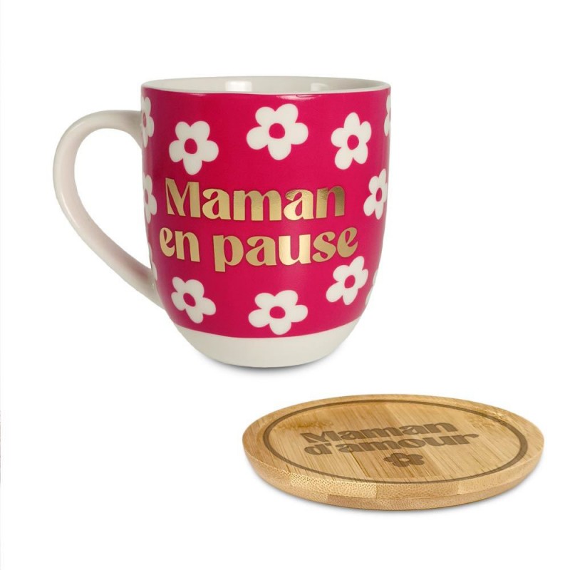 Ce coffret maman, spécial maman d'amour en pause, est composé d'une tasse fleurie en céramique et d'une sous-tasse en bois.