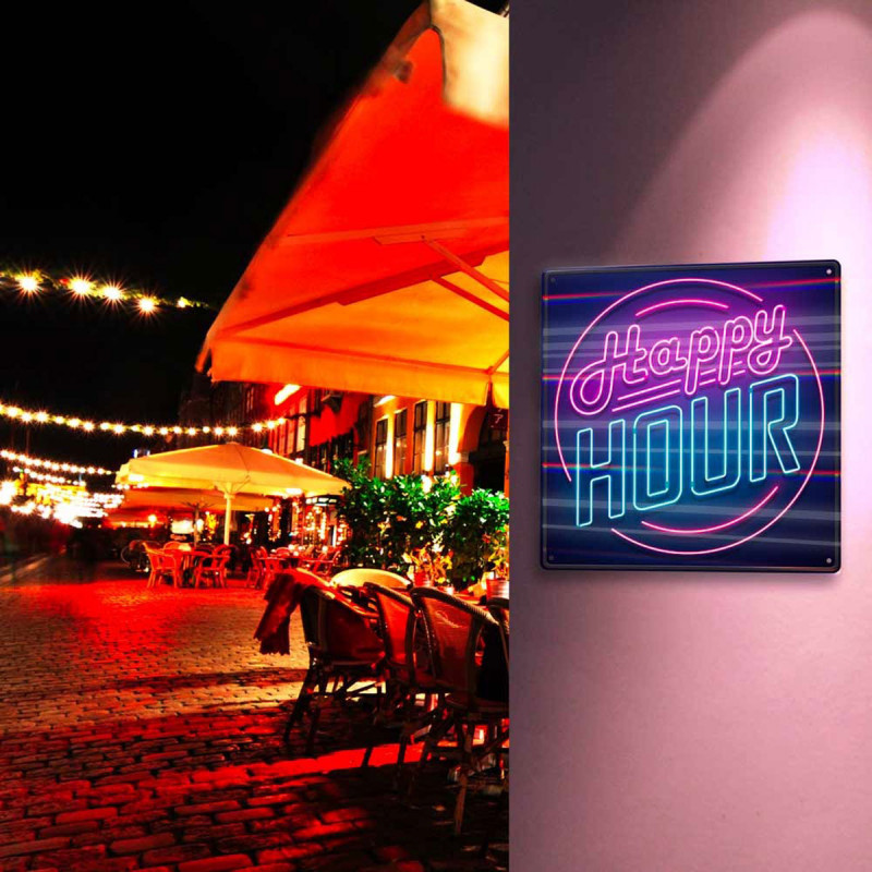 Cette plaque métallique effet néon met à l’honneur la mythique “Happy Hour”.