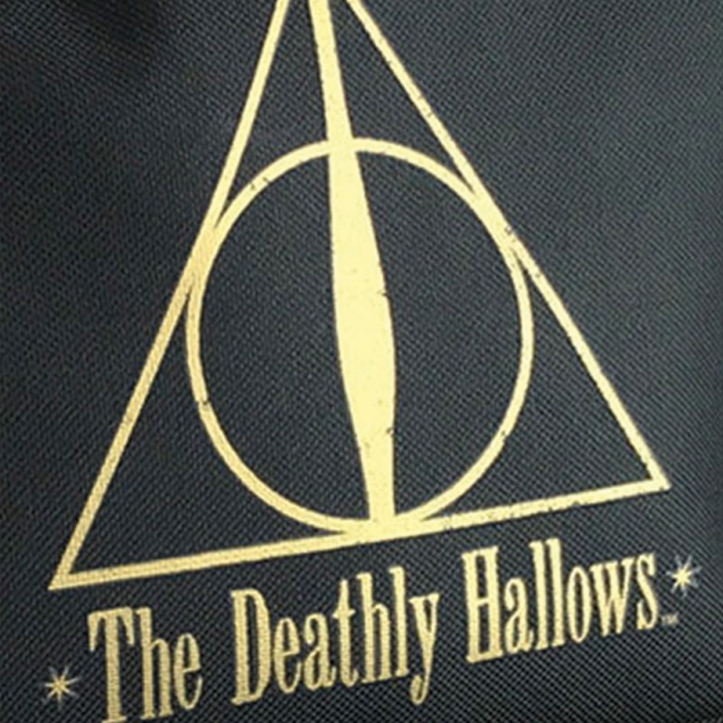 Ce sac à dos Harry Potter, noir et doré, met à l'honneur les Reliques de la Mort.