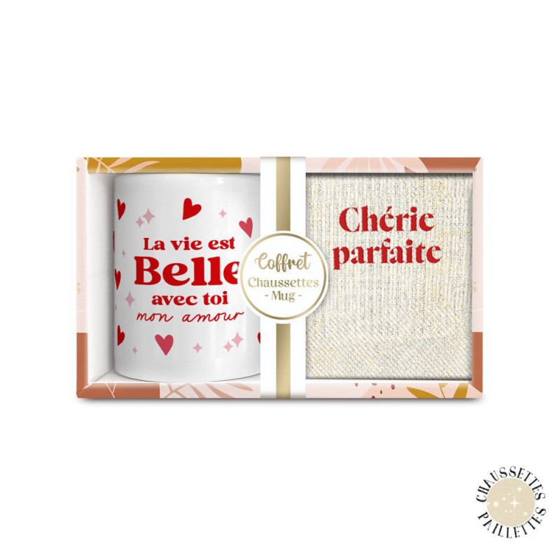 Ce coffret, disponible en différents modèles, est composé d'une tasse colorée en céramique et d'une paire de chaussettes à paillettes assortie.