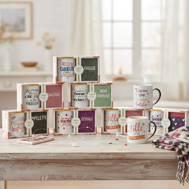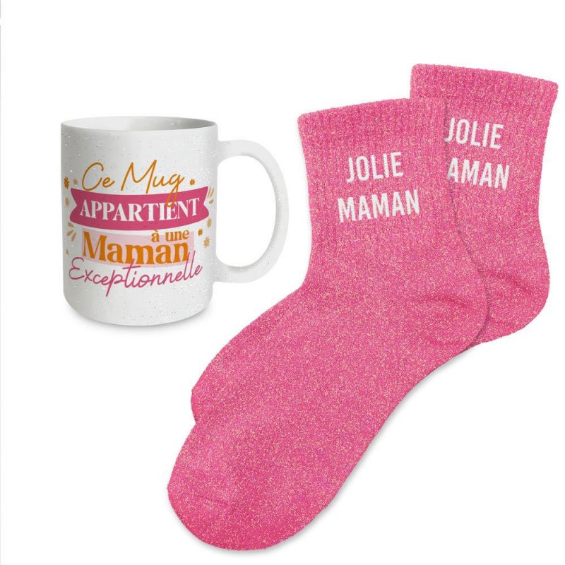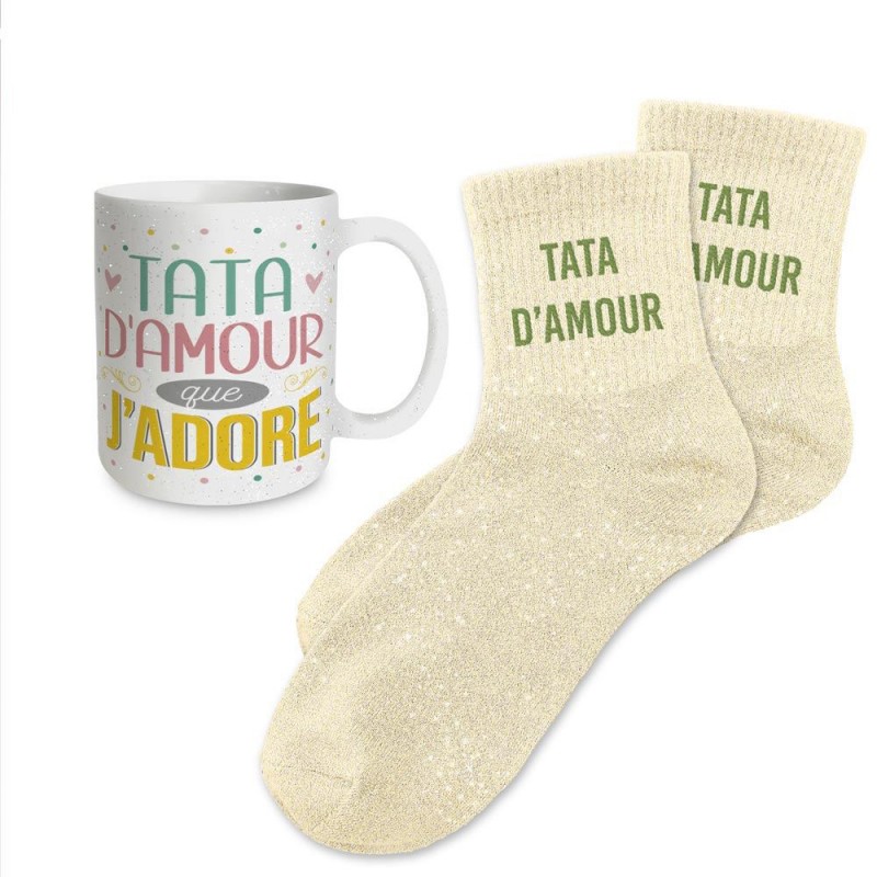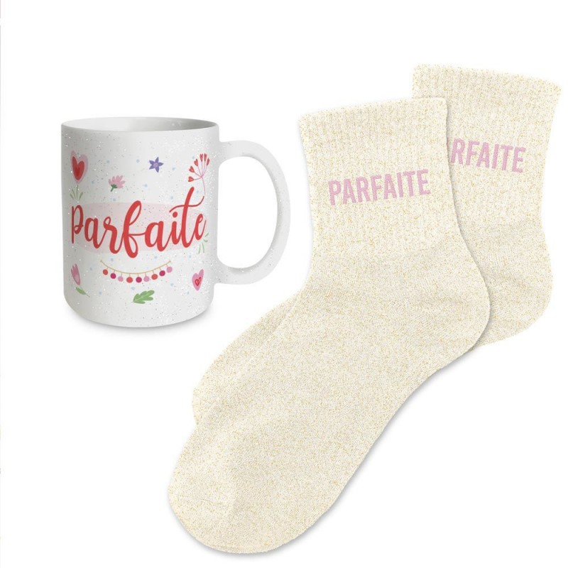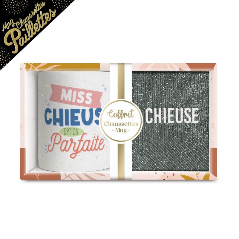 Ce coffret, disponible en différents modèles, est composé d'une tasse colorée à paillettes en céramique et d'une paire de chaussettes à paillettes assortie.