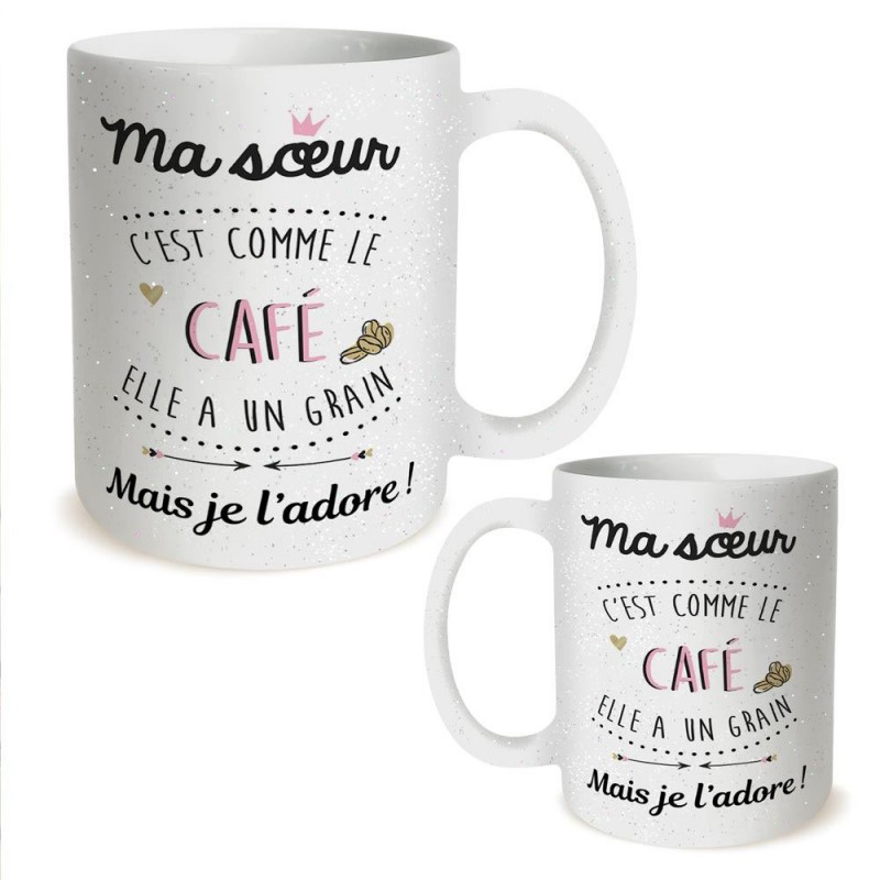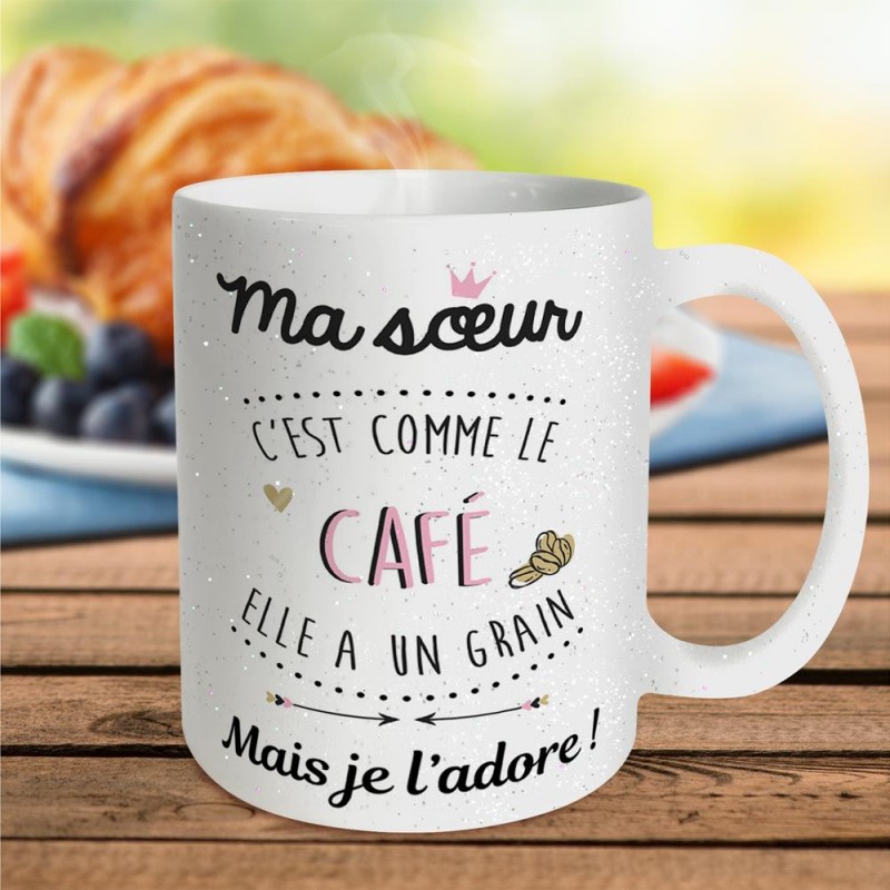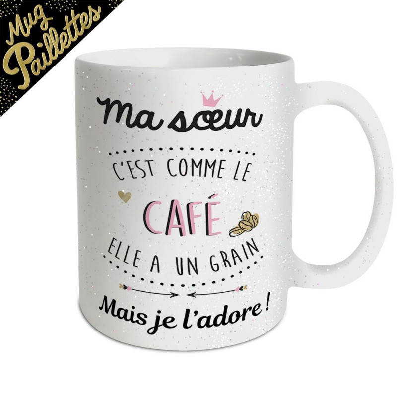 Mug à paillettes « Ma sœur, c’est comme le café, elle a un grain, mais je l’adore ! ».