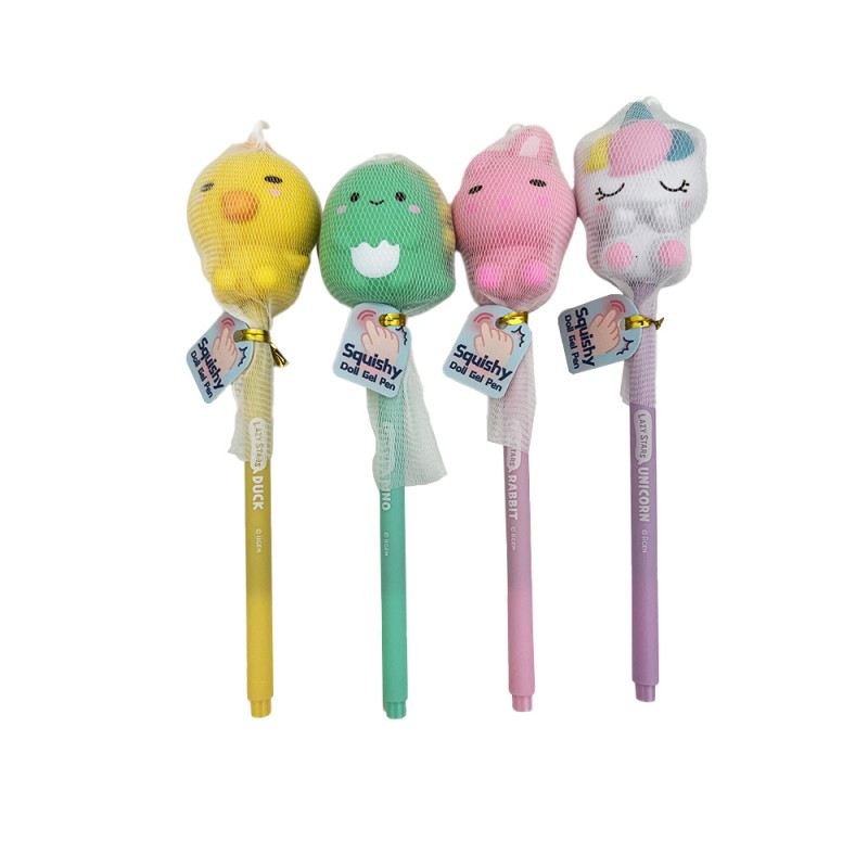 Ce stylo gel fantaisie est surmonté de mignons petits animaux kawaii squishy en 3D (lapin, poussin, dino ou licorne) pour vous accompagner dans tous vos écrits.